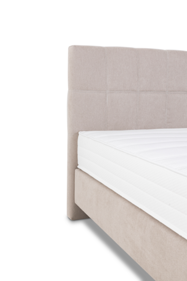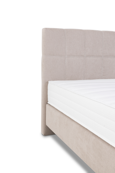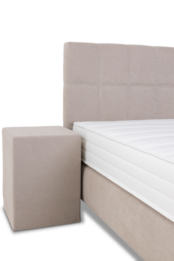 1- Of 2-persoons softside boxspring met: - bonell- of pocketveren in de boxen - Hoofdbord: vlak, met vierkant-doorstikking, zwevend of staand (102H) (zwevend = 90H + 12,5 poothoogte = 102,5H vanaf de grond) - poten van 12,5cm hoog (kan ook 15 of 20H) - pocketveermatras (medium of firm) met vast of afneembare, wasbare (40°C) hoes (vulling 200g poly-fill/m²). Keuze tussen 3 soorten comfortlagen van steeds 3cm dik langs beide kanten van de matras: Harmony HR35, latex of visco.