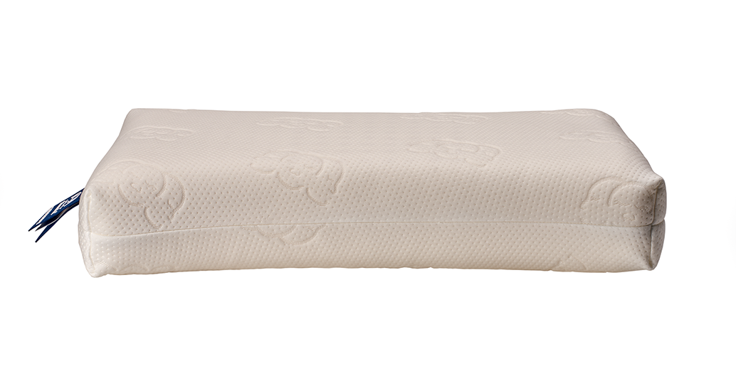 Een laag en zacht ergonomisch gevormd latex hoofdkussen.