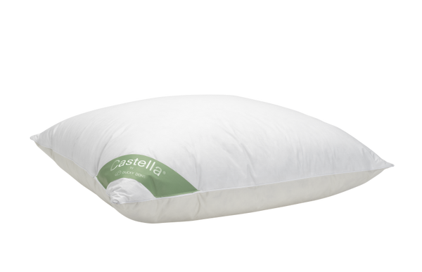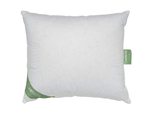 Bij de Castella Double Face is het hoofdkussen aan de ene kant zachter (gevuldmet 90% eendendons en 10% -veertjes) en aan de andere kant stevig (gevuldmet 15% eendendons en 85% -veertjes).