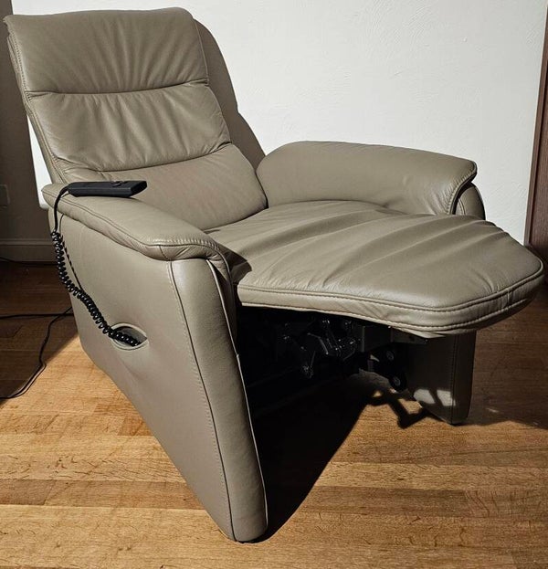 Showroommodel: kleinste maat, in leder, met hartbalans, sta-op lift en elektrisch verstelbare hoofdsteun