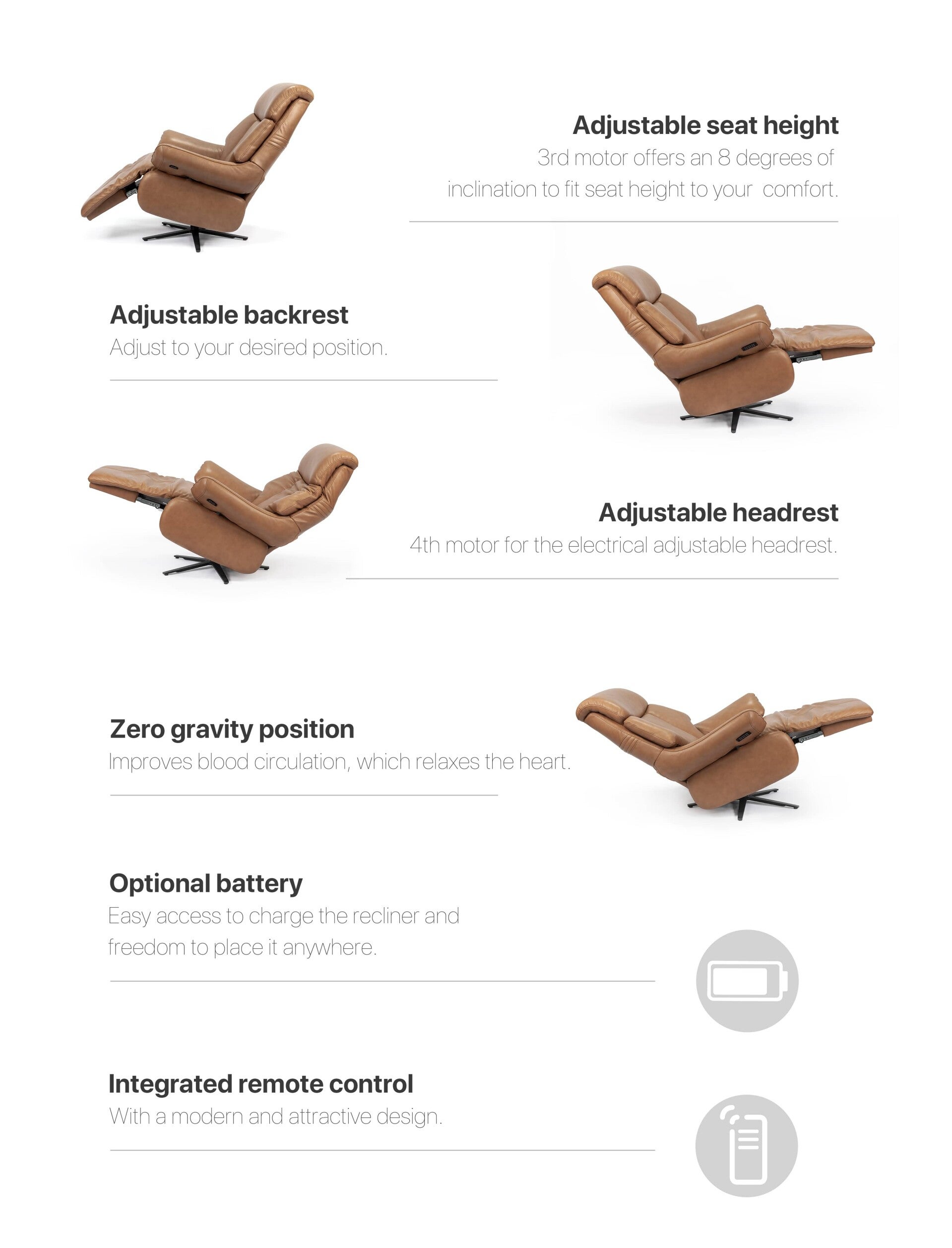 Zitgedeelte (8°), rugleuning, beensteun en hoofdsteun elektrisch verstelbaar (4 motoren) tot hartbalans-positie. 5-Teens draaivoet.